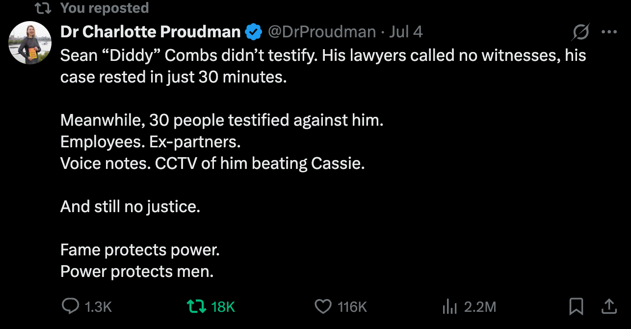 Sean Combs (P Diddy, Puff Daddy, etc) trial has come to an end. It's an incredibly complex case but despite the sensitive nature of the case, it has sparked some shocking reactions, including this highly triggering BBC headline, which I won't include here as it's bound to be upsetting to any victims of domestic violence.